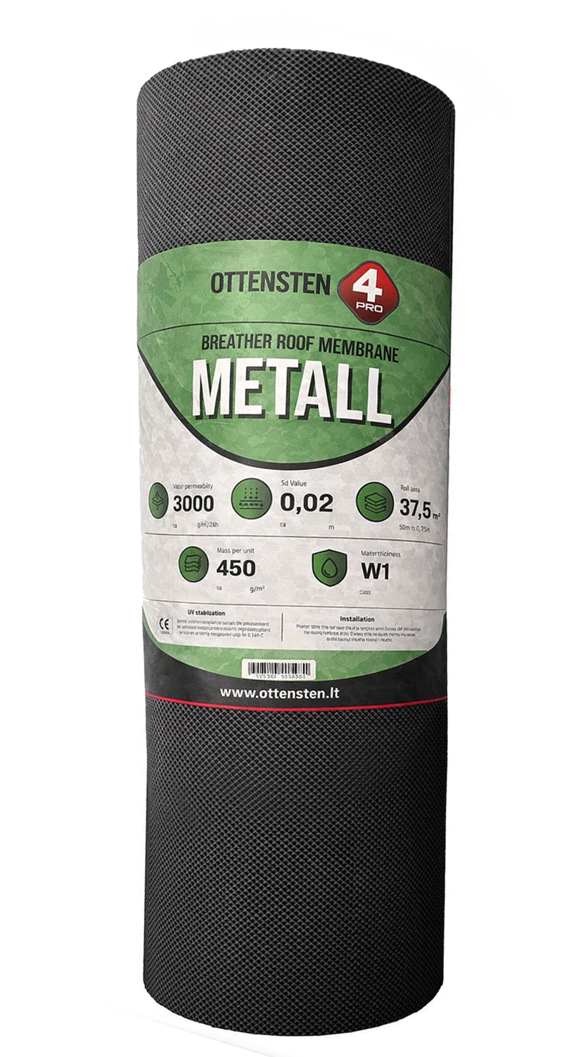 METALLIC jumta membrāna ir trīsslāņu, tvaiku caurlaidīga membrāna ar pītu polipropilēna atdalošo slāni, īpaši izstrādāta metāla jumtu sistēmām. Tā kalpo kā sākotnējais segums siltinātiem un ventilētiem slīpiem jumtiem, tostarp arī ar pilnu klājumu un stāvo šuvju jumtiem. Tāpat to izmanto kā drenāžas un ventilācijas slāni ventilējamās un neventilējamās metāla fasādēs. Pītais slānis nodrošina gaisa telpu, kas ļauj efektīvi novadīt mitrumu un kondensātu, pagarinot jumta kalpošanas laiku. Pieejama arī ar SK2 sistēmu – divām integrētām līmlentēm ērtākai montāžai.