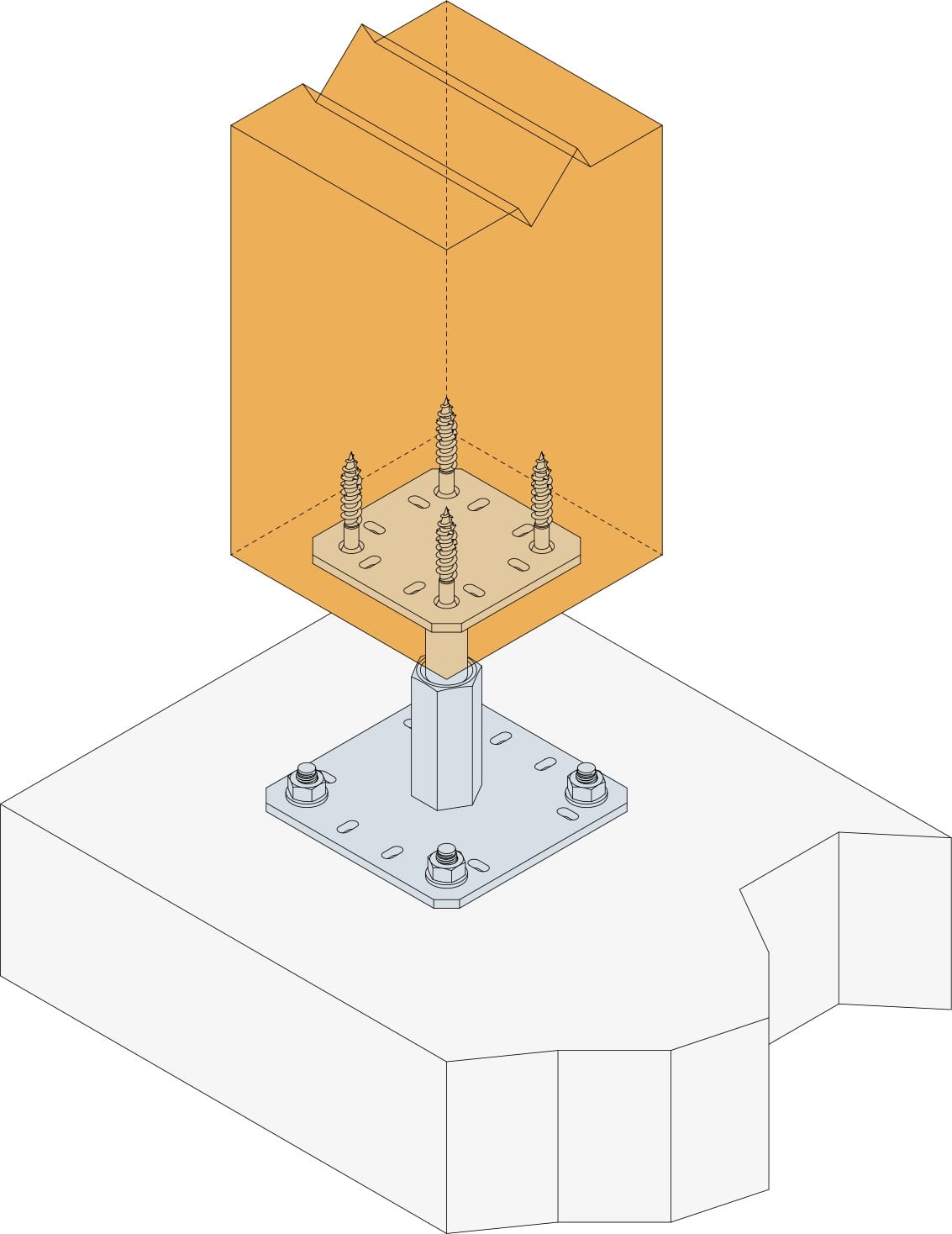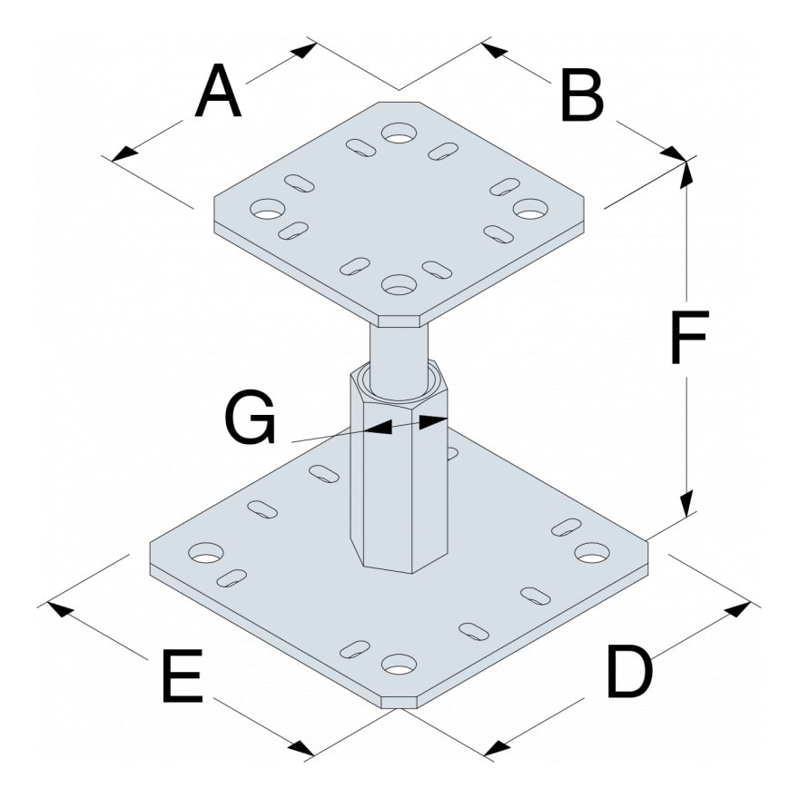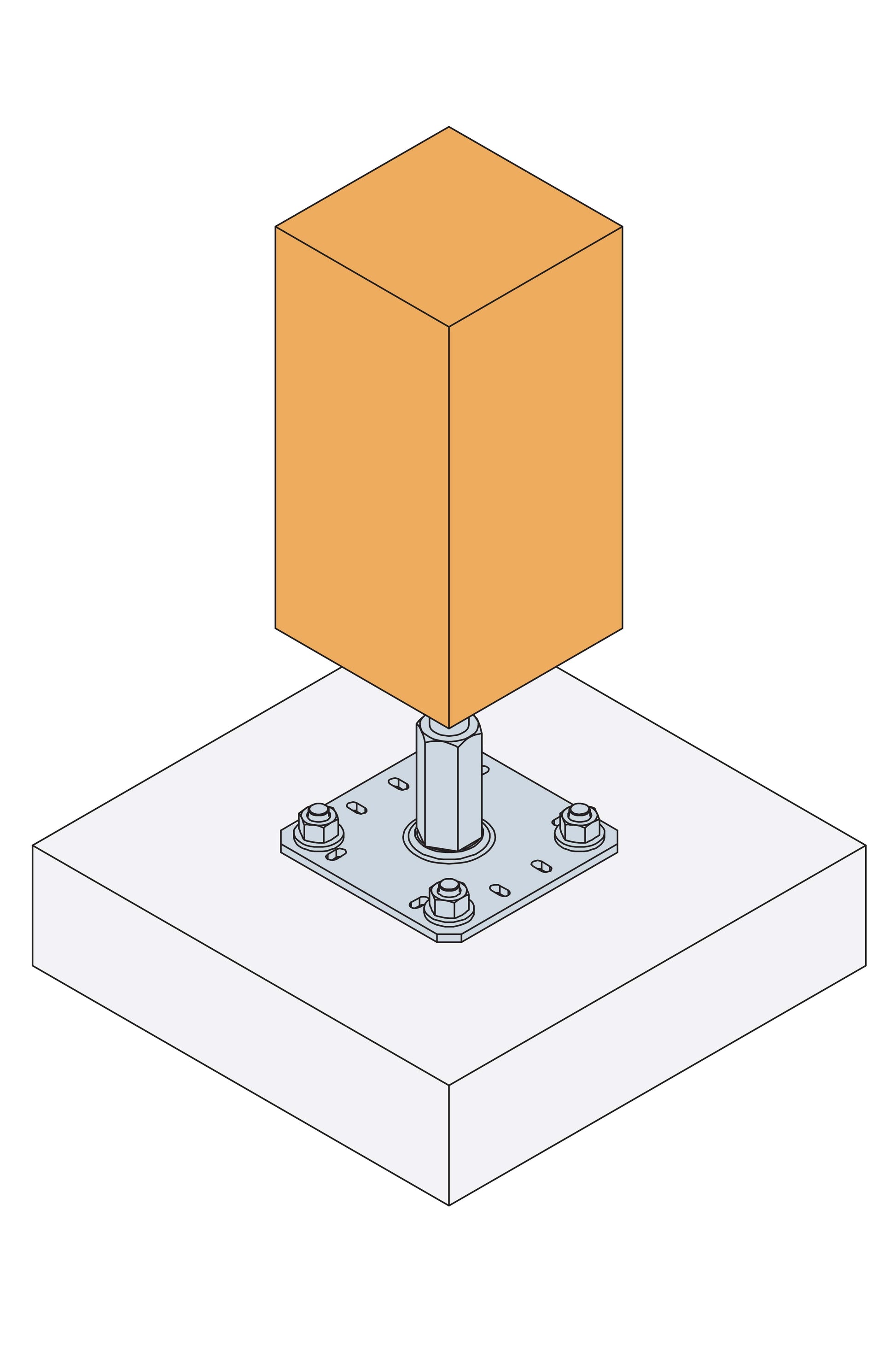 Cinkota tērauda regulējama staba pamatne. PPRC ļauj pielāgot struktūru pēc tās uzbūvēšanas. Noregulējiet augstumu no zemes 100 līdz 150 mm diapazonā pat pēc staba uzstādīšanas. Piemērots stabiem no 100x100mm līdz 200x200mm.