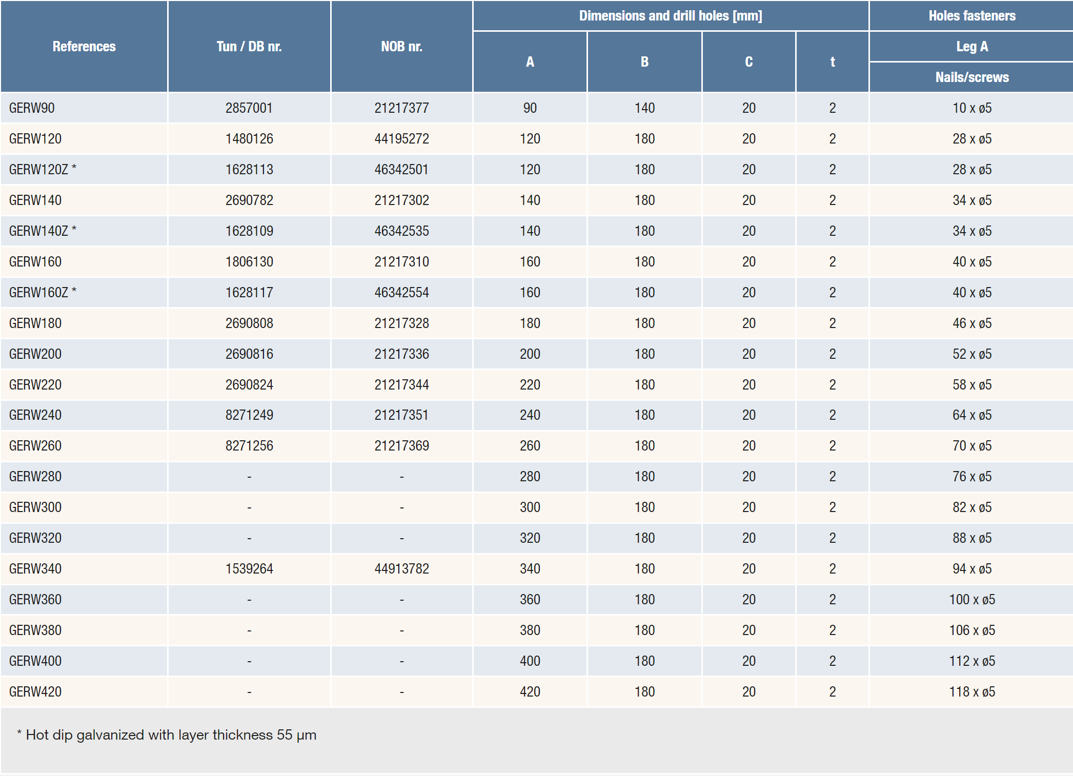 Cinkots tērauds 55 µm. Savienotāji GERW ir piemēroti parastajām satveršanas sijām. Turklāt šķērsspēki vertikālā virzienā var absorbēt spēkus sijas virzienā un tāpēc ir piemēroti spēka novirzīšanai. Atkarībā no slodzes var izmantot gan daļēju, gan pilnu naglojumu.