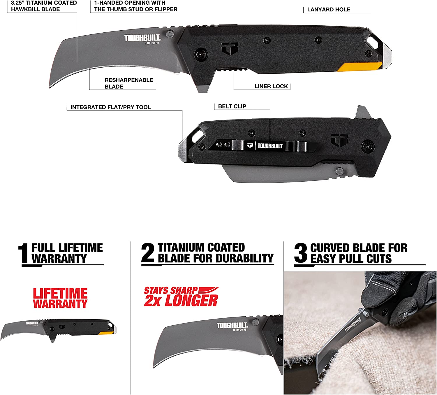 ToughBuilt® izliektais saliekamais nazis palielina produktivitāti darba vietā. Ar izliekto āķa formas asmeni ir viegli nogriezt vai noņemt kabeļa izolāciju, pavelkot asmeni. Nerūsējošā tērauda asmenim ir asa griešanas mala, ko var atkārtoti uzasināt. Šis izturīgais nazis atbilst stingrām profesionāļu prasībām.