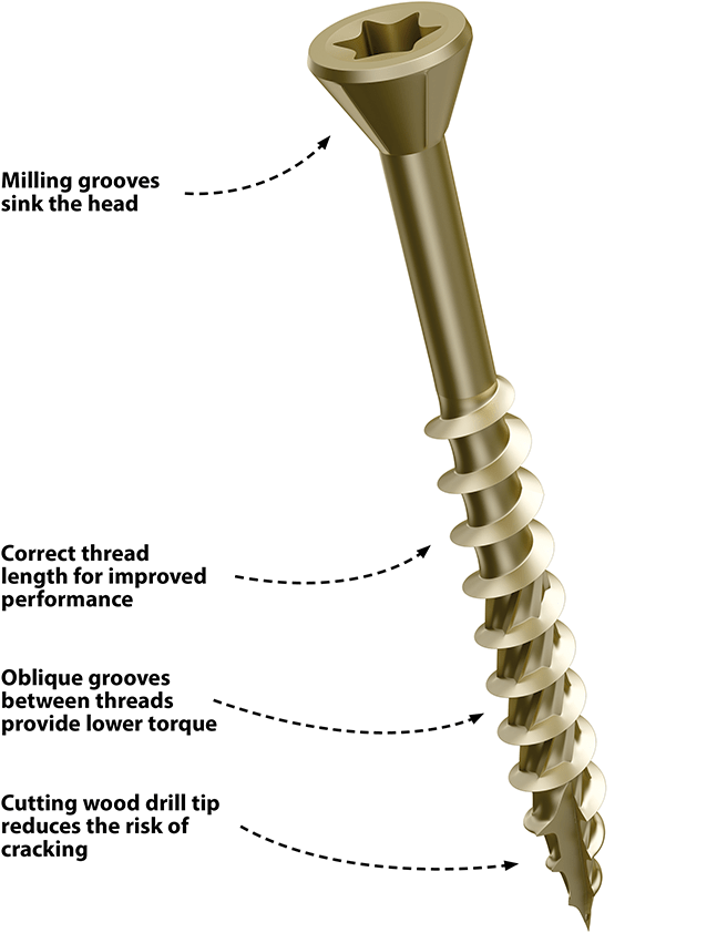 Skrūves priekšurbis nodrošina, ka skrūve ieskrūvējot nešķeļ koksni. Nav nepieciešama priekšurbšana. Papildus urbis, kas izvietots virs vītnes nodrošina garāku skrūvju vieglāku ieskrūvēšanu, samazinot tās skrūvēšanas pretestību. Ieteicamais skrūvēšanas apgriezienu skaits – 400-1200 apgr./min