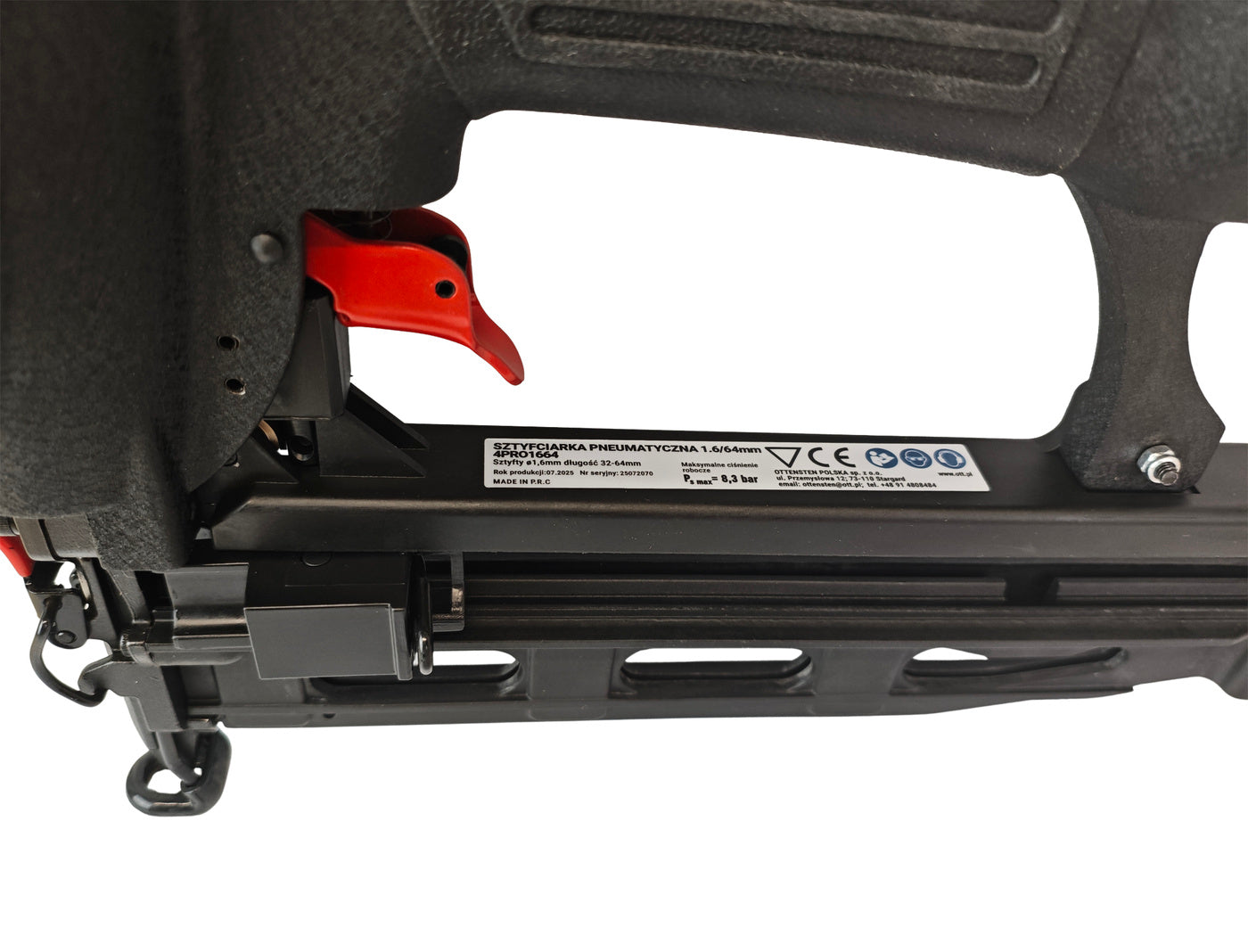 The 4PRO 4PRO1664 is a pneumatic brad nailer designed for driving 1.6 mm brads in the 32-64 mm length range. It features a die-cast aluminum housing for a durable yet lightweight build, depth adjustment for controlled fastening, and a front-opening mechanism for quick removal of jammed brads. The tool includes a comfortable grip, a 360° adjustable air exhaust, and a metal magazine with easy loading and a 100-brad capacity.