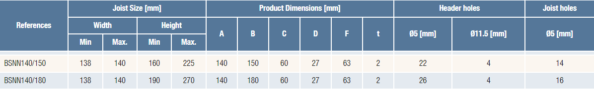 The BSNN series are sturdy holders designed for use in cases where exceptional durability is required. The hangers are attached using CNA system screws, but their surface also has holes for 12 mm fasteners. The depth of the hanger must be at least 2/3 of the height of the supporting element to avoid structural displacement, unless additional lateral reinforcement is added to the top of the supporting element.