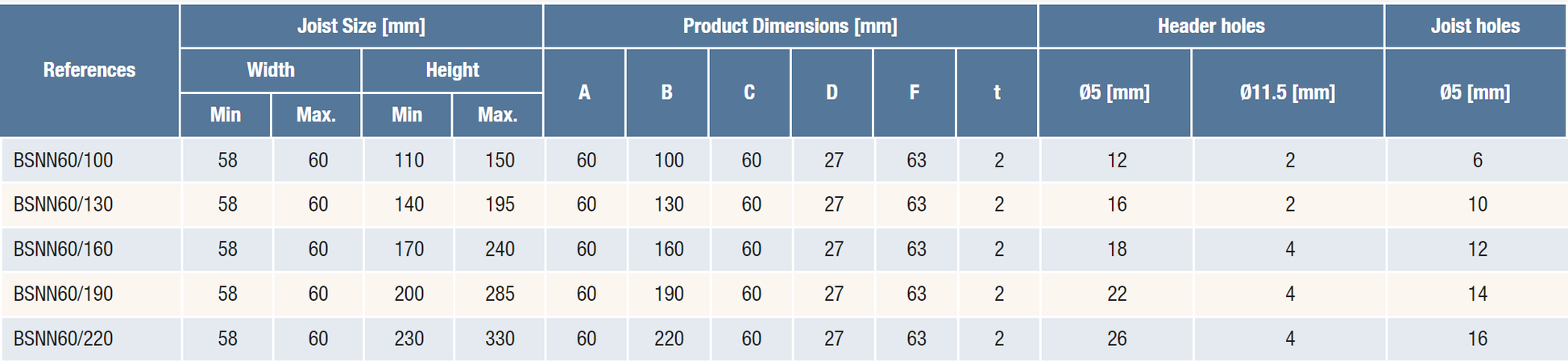 The BSNN series are sturdy holders designed for use in cases where exceptional durability is required. The suspensions are attached using CNA system screws, but their surface also has holes for 12 mm fasteners. The depth of the suspension must be at least 2/3 of the height of the supporting element to avoid structural displacement, unless additional lateral reinforcement is added to the top of the supporting element.