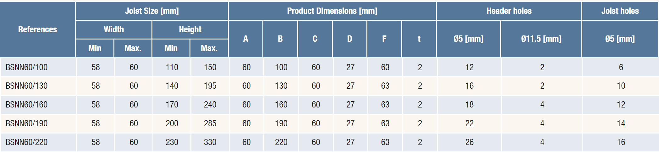 The BSNN series are sturdy holders designed for use in cases where exceptional durability is required. The hangers are attached using CNA system screws, but there are also holes on their surface for 12 mm fasteners. The depth of the hanger should be no less than 2/3 of the height of the supporting element to avoid structural displacement, unless additional lateral reinforcement is added to the top of the supporting element.