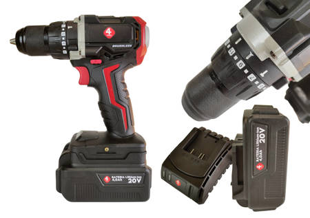 The 4PROPT190101 cordless drill with a torque of 50 Nm and an impact function. 4000 mAh battery capacity.