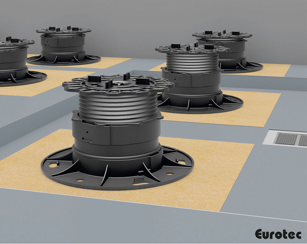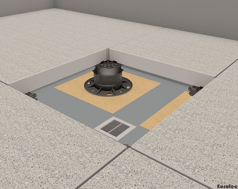 When adjusting legs are used, for example, on PVC film, problems may arise due to the softeners in them. The mat protects against the contact of two plastics. At the same time, it protects against mechanical surface damage. Without PAH (hazardous rubber plasticizers)