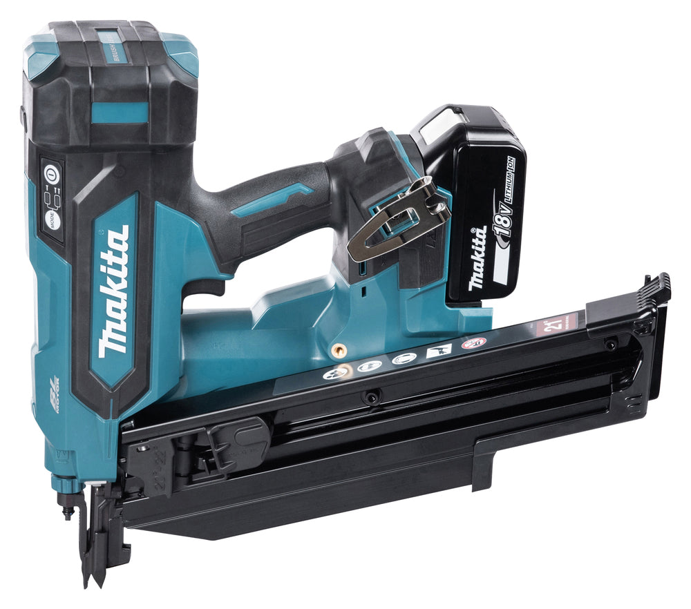 The Makita DBN901 is an 18 V cordless framing nailer from the LXT® system equipped with a brushless motor and an air-spring drive mechanism. This enables driving 50 – 90 mm round-head nails with performance comparable to pneumatic nailers, but without requiring hoses or air compressors.