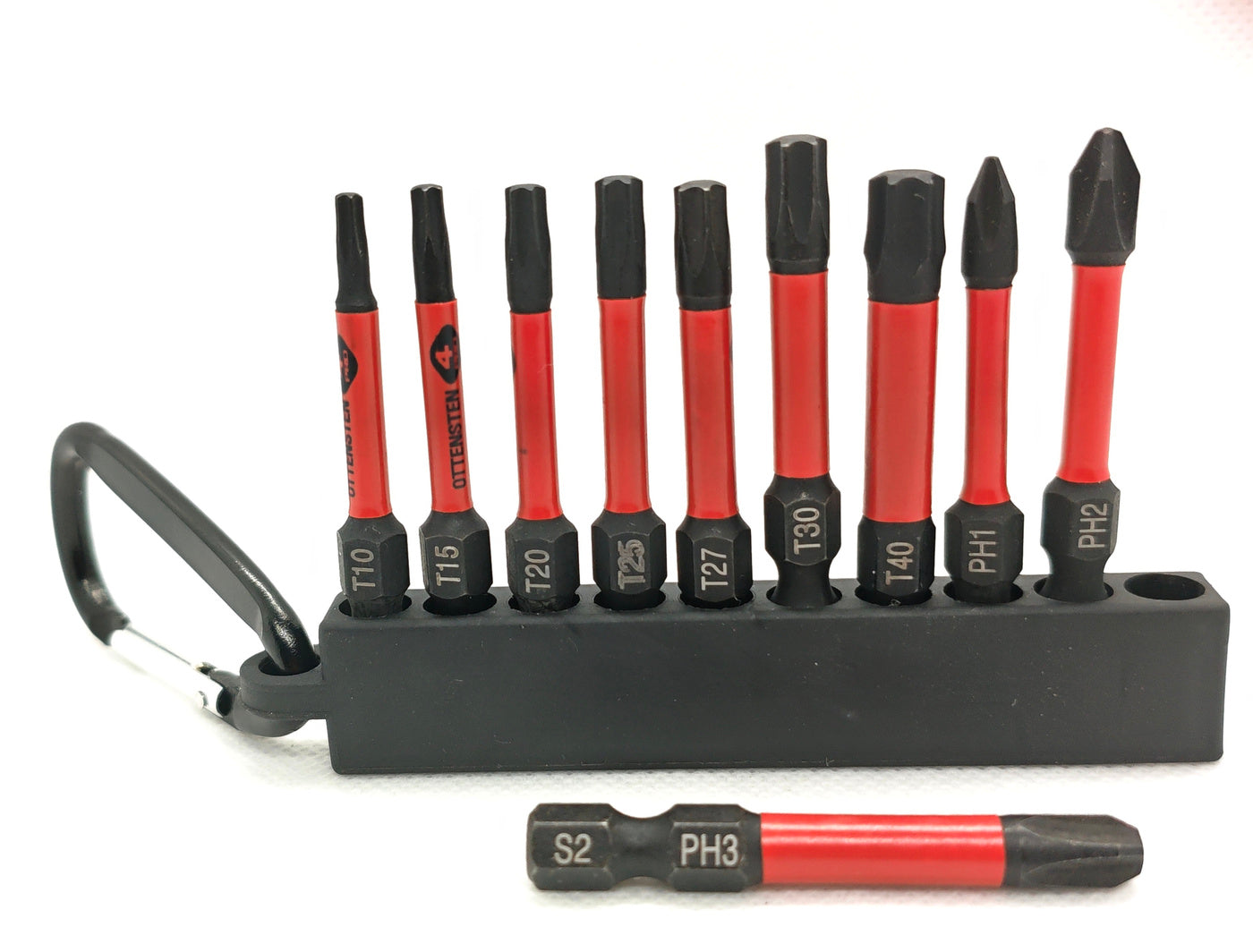 Komplektā iekļauta praktiska gumijas siksna ar karabīni, kas ļauj droši noturēt uzgaļus kopā un ērti piestiprināt pie jostas, instrumentu somas vai darba apģērba, nodrošinot ātru piekļuvi darba vietā.
