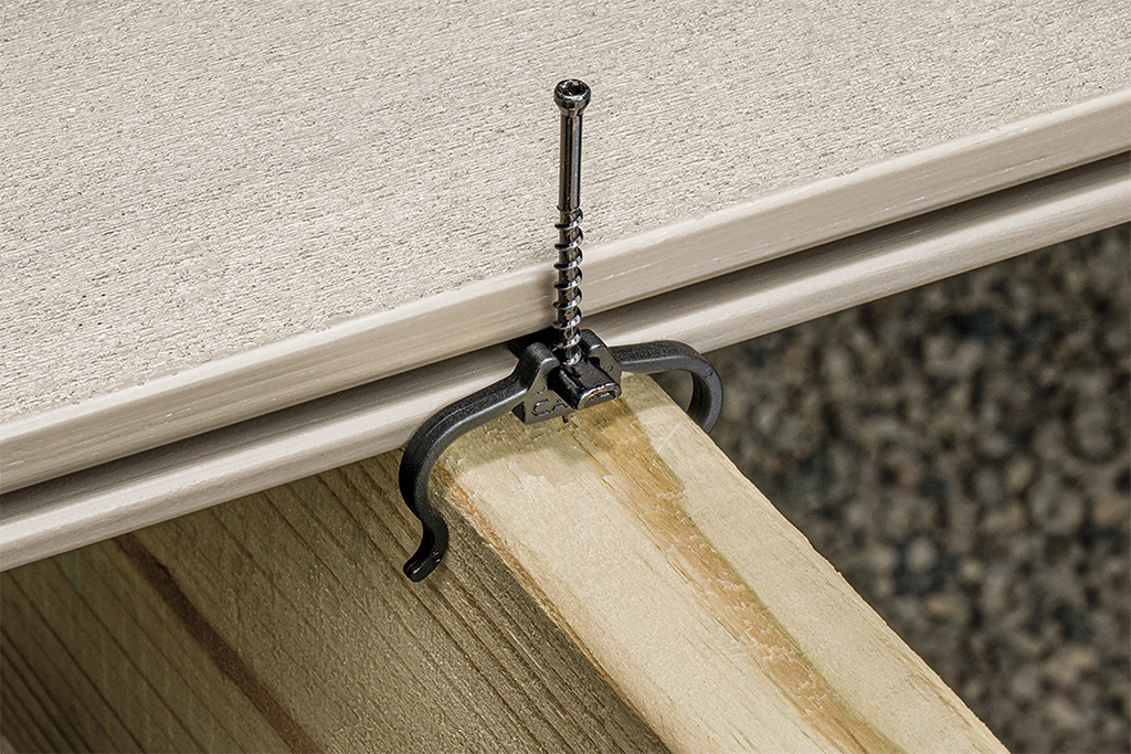 - EDGE Clips stiprinājumi ir iepriekš samontēti, tāpēc montāža ir ātra un vienkārša – ievieto stiprinājumu dēļa profilā, tas turēsies, līdz būsiet gatavs to piestiprināt. Stiprinājumus iespējams piestiprināt ar komplektā iekļauto NEVER-MISS vadotni, kā arī ar CAMO ClipDRIVE vai CAMO DRIVE instrumentiem. Ievēro: nedrīkst lietot impulsa skrūvmašīnas, jo tās var apraut skrūves galvu vai sabojāt klipsi!