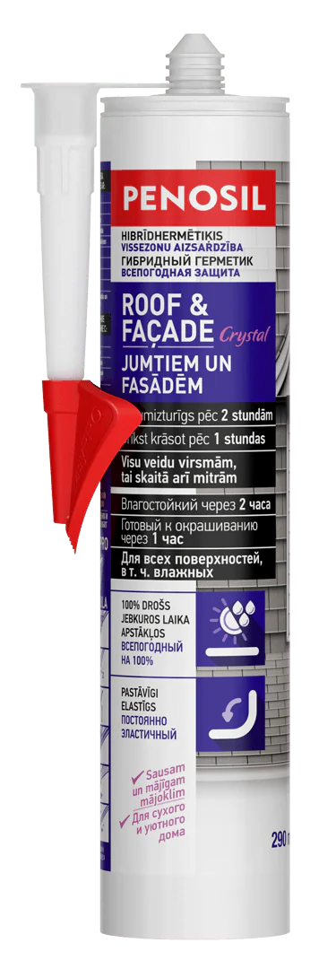 PENOSIL Roof & Facade Crystal ir caurspīdīgs hibrīdhermētiķis, kas paredzēts āra remontdarbiem, blīvēšanai un renovācijai jumtu un fasāžu konstrukcijās. Tas nodrošina aizsardzību pret laikapstākļu iedarbību, vienlaikus saglabājot vizuāli neuzkrītošu savienojumu.