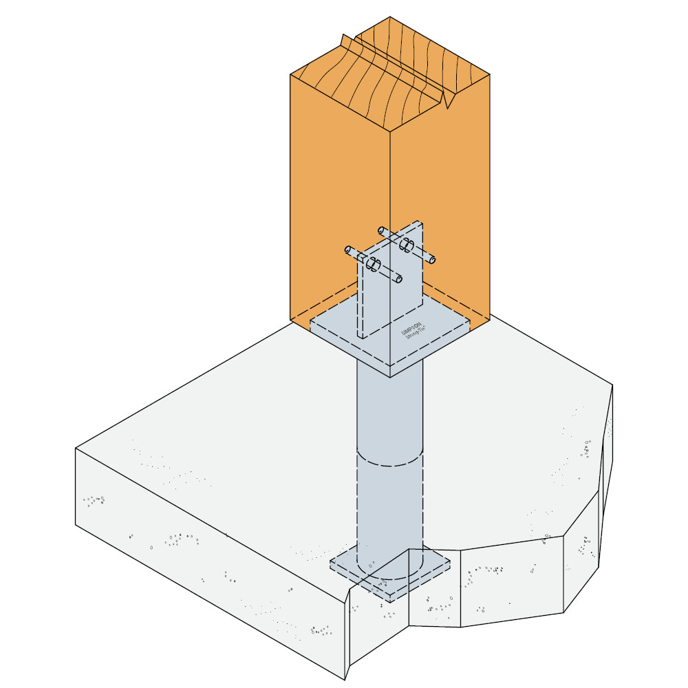 Balstam ir 15 mm bieza pamatplate ar pievienotu Ø70 mm cauruli, kas nodrošina stingru balstu stiprinājumu. Augšpusē izvietota 8 mm bieza plate ar Ø12 mm dībeļu caurumiem, ļaujot droši savienot balstu ar koka konstrukcijas elementiem. Balsts ir karsti cinkots ar aptuveni 55 μm pārklājumu (DIN EN 1461), nodrošinot aizsardzību pret koroziju.