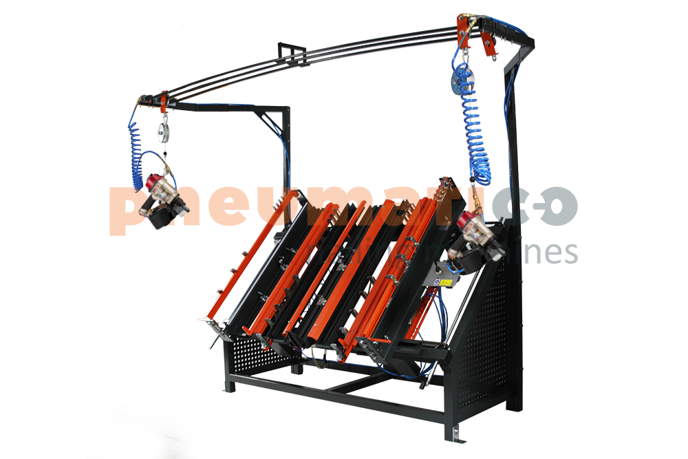 Pusautomātiskā palešu naglošanas iekārta ir ideāls risinājums dažādu izmēru kvalitatīvu palešu ražošanai. Tās konstrukcija pieļauj ātru un vieglu palešu naglošanas izmēru maiņu, tādejādi nodrošinot ātru pārslēgšanos no standarta uz nestandarta palešu naglošanu. Ir nepieciešams tikai viens operators un tās ražība sasniedz 210-230 paletes 8 stundu maiņā (atkarībā no operatora prasmēm un darba organizācijas). Divi naglotāji ar dažāda izmēra naglām ir iestiprināti divos balansētājos, lai atvieglotu instrumentu novietošanu. Pneimatiskie bloku turētāji un palešu pacēlāji nodrošina augstu palešu kvalitāti un vieglu izcelšanu. Darba augstums un slīpums ir regulējami.