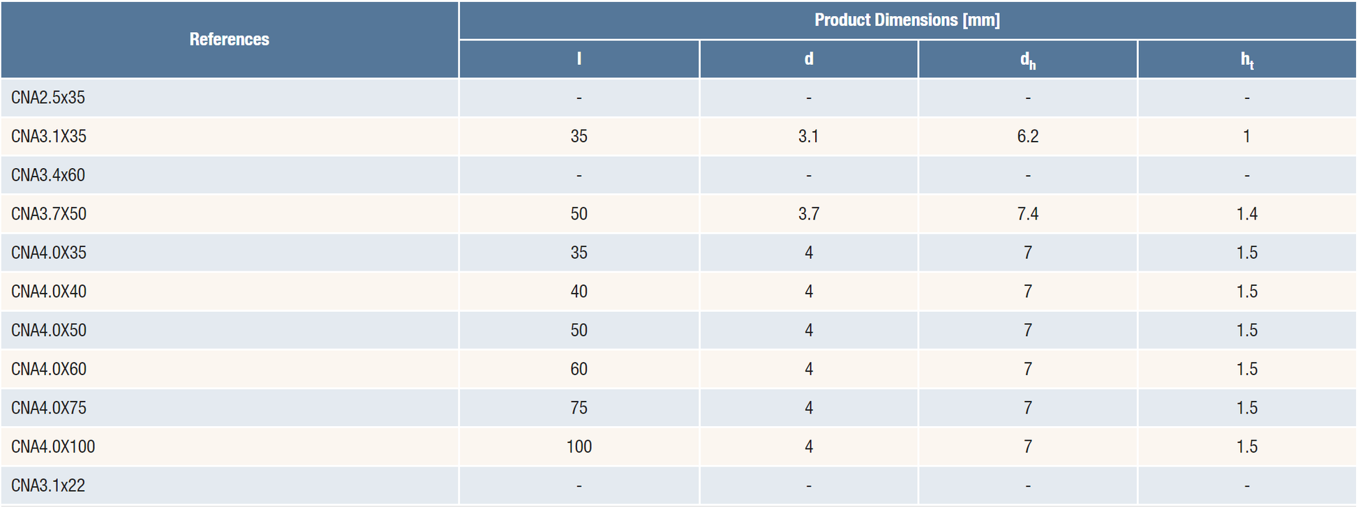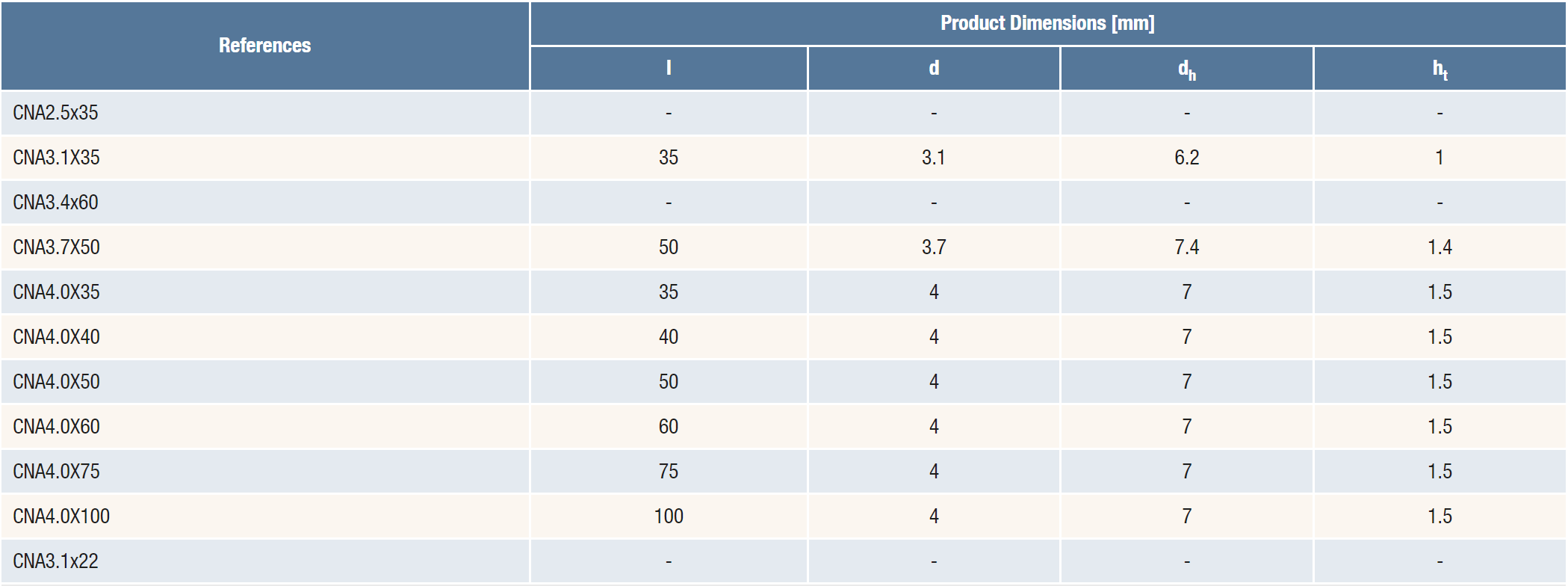12µm cinkota tērauda enkurnaglas. CNA naglas ir rievotas enkurnaglas ar konisku formu. Šīs naglas ir ieteicamas konstrukciju montāžai un Simpson Strong-Tie būvkalumu, montāžas leņķu un citu savienojumu uzstādīšanai pie kokmateriāliem, lai nodrošinātu konstrukciju noturību. Naglām ir veikti visi nepieciešami testi, lai tās varētu izmantot visos celtniecības projektos, kur nepieciešami CE un ETA sertifikāti.