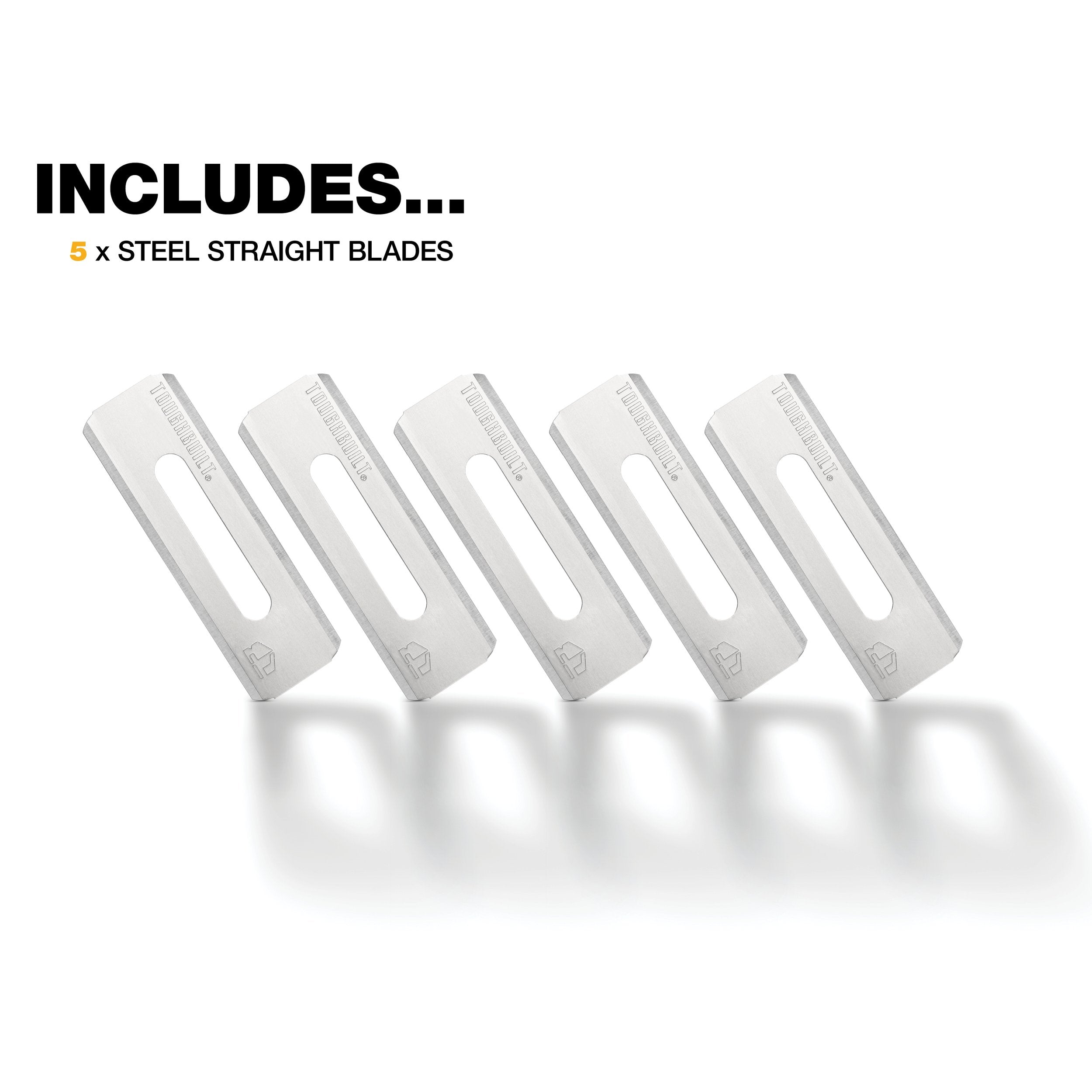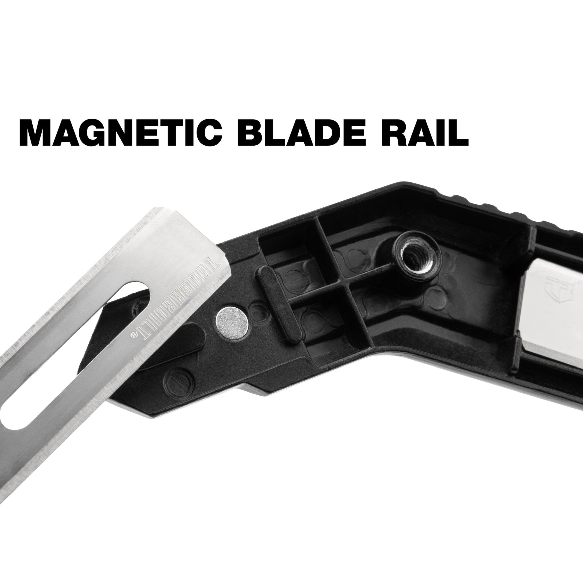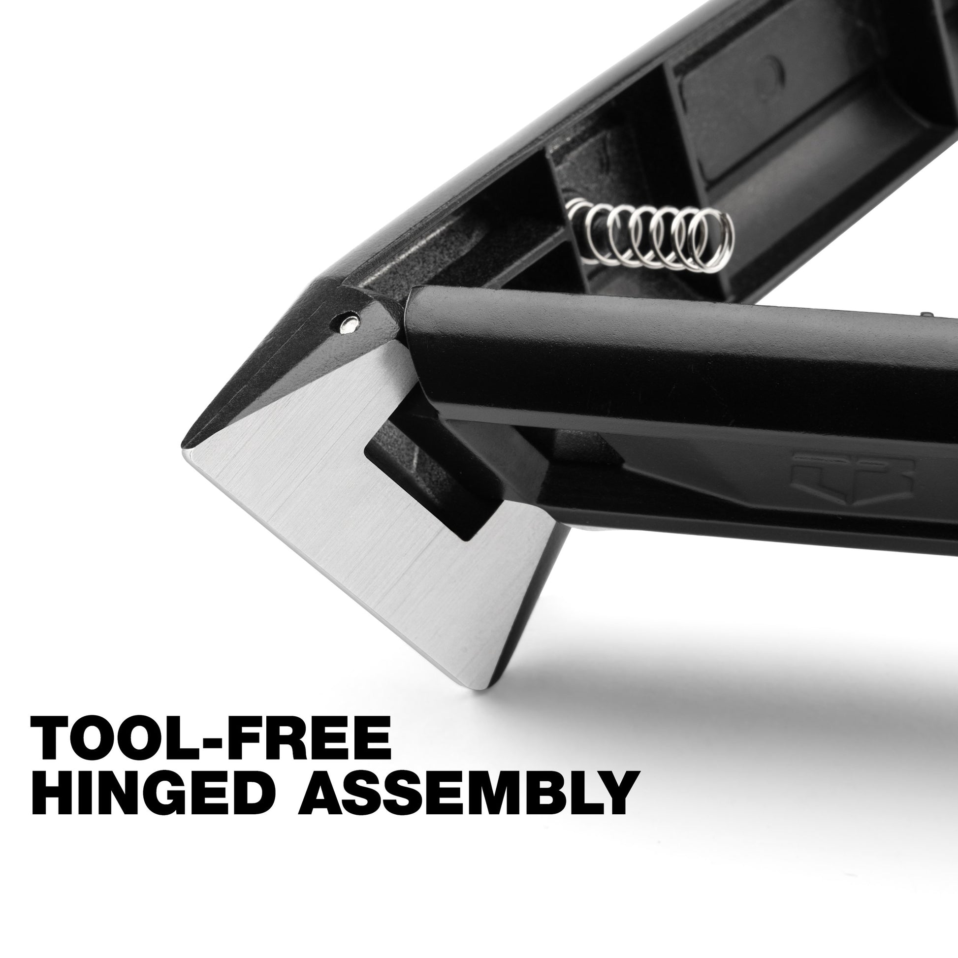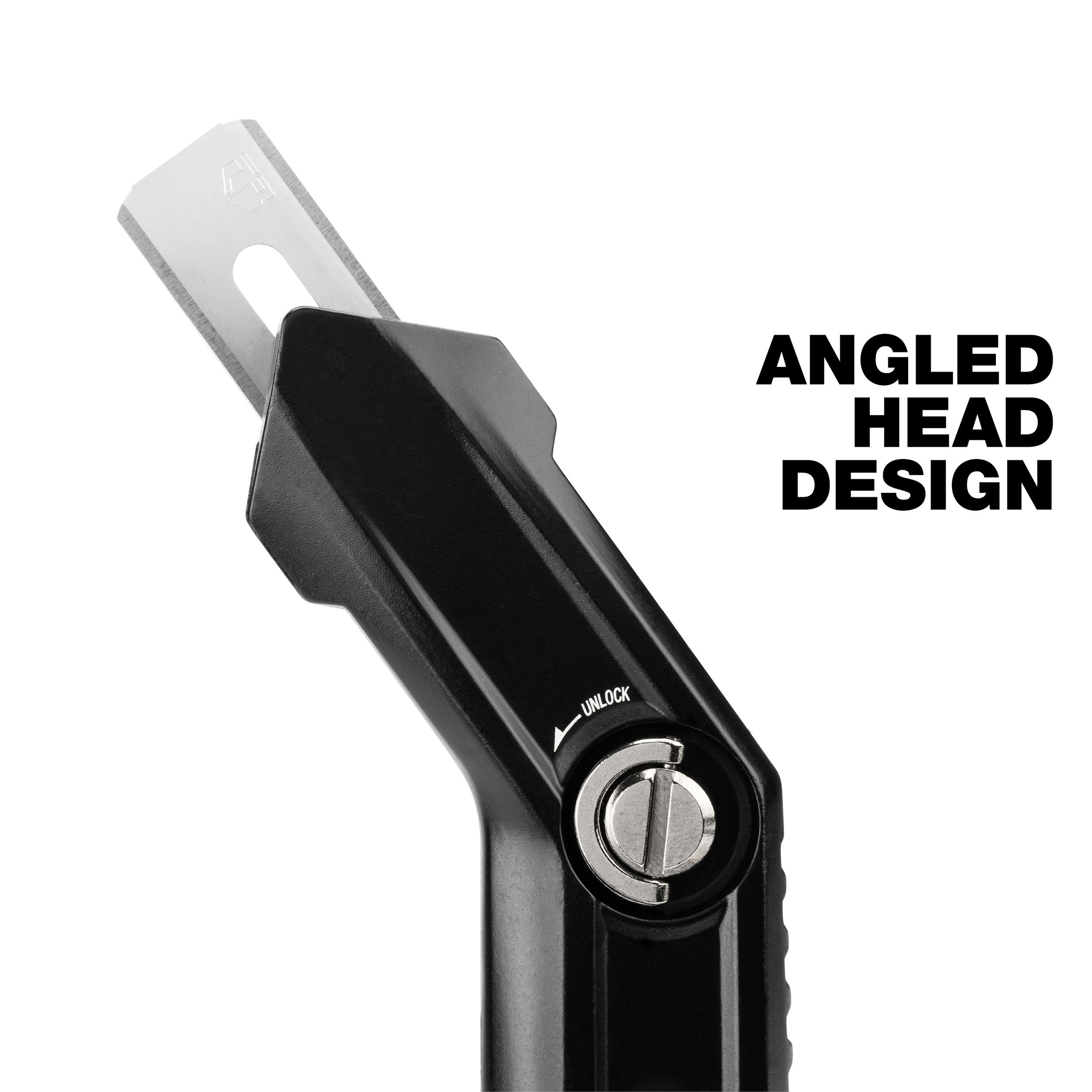 Slīpais galvas dizains ir izstrādāts, lai novērstu locītavu nobrāzumus, piedāvājot drošāku un ērtāku griešanas pieredzi. Eņģu konstrukcija ar fiksatoru nodrošina piekļuvi piecu asmeņu uzglabāšanai un ļauj ātri un viegli nomainīt asmeņus.