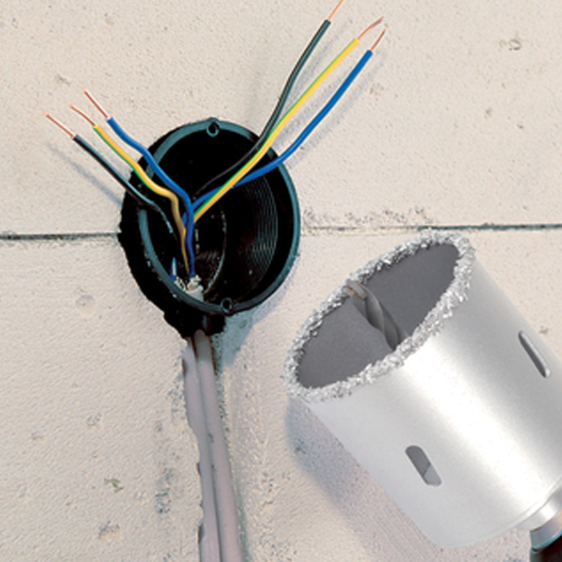Rozetu un slēdžu uzstādīšanai ķieģeļu sienās un akmenī, griešanas dziļums 55 mm ar volframa karbīdu pārklāts gredzenveida uzgalis, iepriekš samontēts, ieskaitot serdi ar sešstūra kātu un centrēšanas urbi (Ø 8 mm).